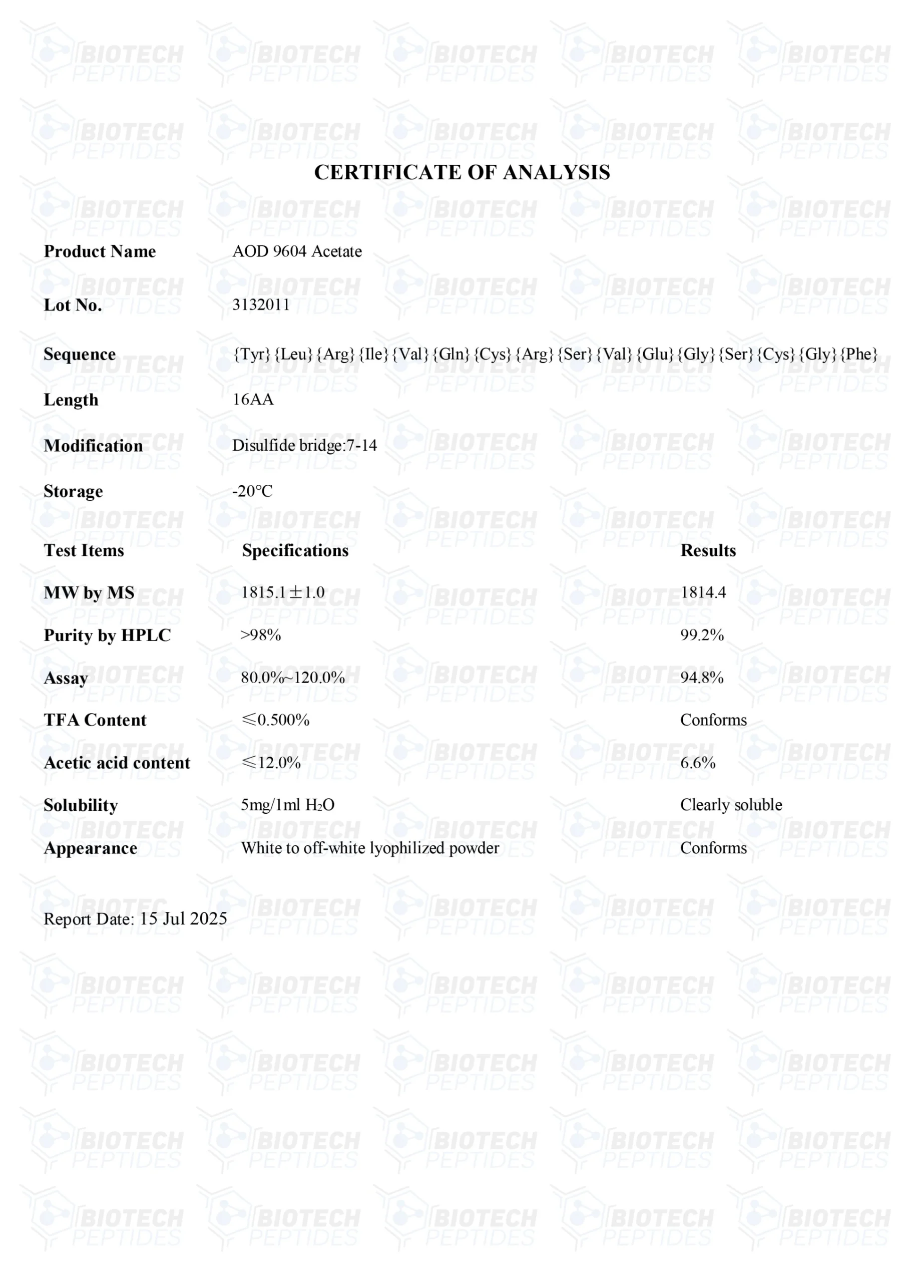 AOD 9604 is a modified peptide initially developed as an offshoot in obesity research. It modifies the peptide Fragment 176-191 of the growth hormone hGH by adding a tyrosine residue to the N-terminus. The proposed mode of action of AOD 9604 has been suggested by researchers to be restricted to promoting lipolysis, thus linking the synthetic compound to obesity research.[1] The peptide does not appear to affect levels of insulin or IGF1 in studies thus far; therefore, it does not appear to trigger diabetes development or induce glucose intolerance in test models, though further studies are necessary to explore this aspect.[2]