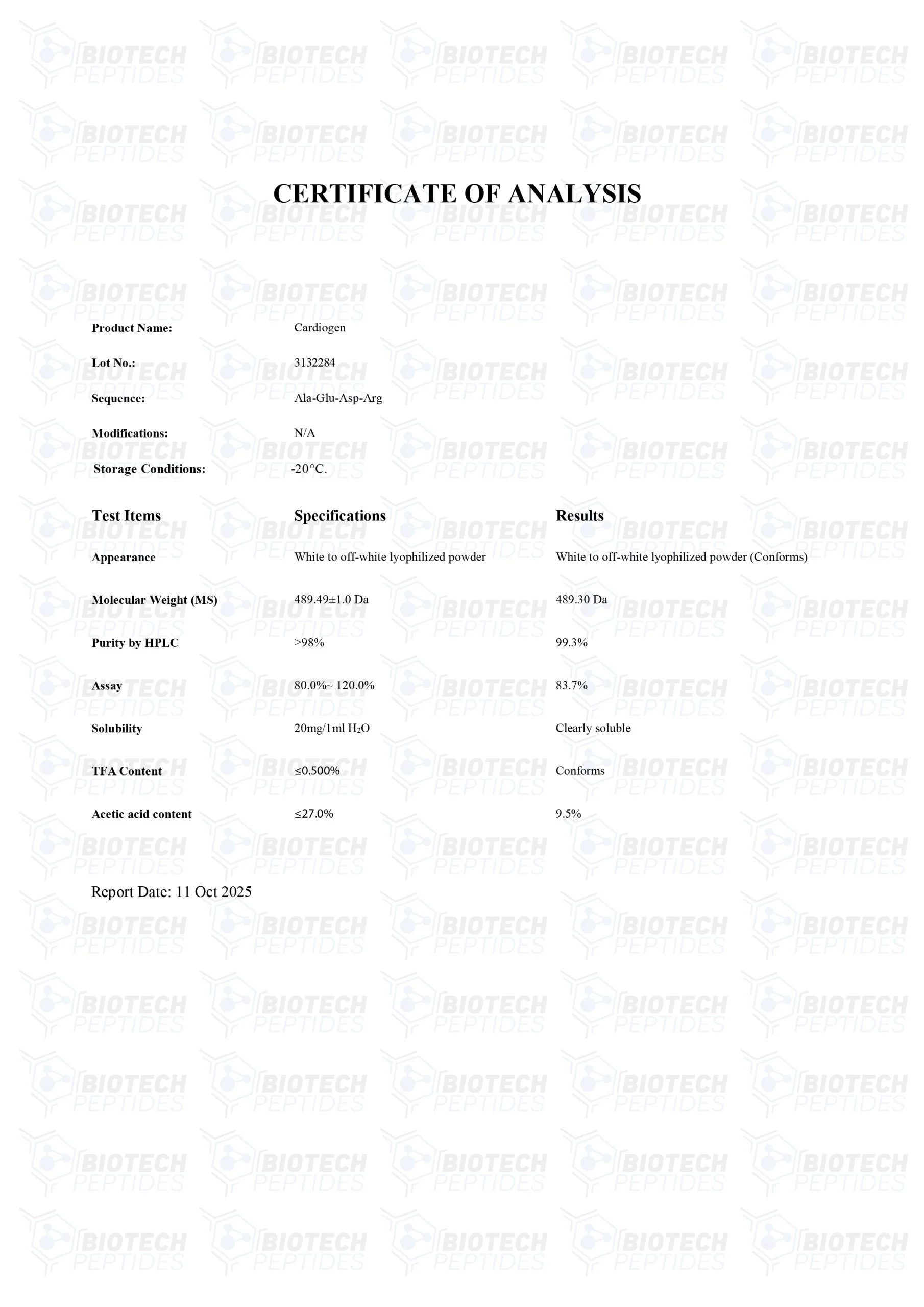 Cardiogen is a cardiovascular bioregulator peptide complex. Results obtained from research studies suggest that Cardiogen’s primary functions may be correlated to fibroblast action, cells considered responsible for scar formation and tissue repair. The peptide has a sequence of H-Ala-Glu-Asp-Arg-OH (AEDR).[1] Research posits that the synthetic tetrapeptide Cardiogen may potentially stimulate cell proliferation in myocardial tissue. Additionally, it appears that Cardiogen may possibly inhibit myocardial cell apoptosis (cell death), hypothetically through the reduction of p53 protein expression.[2]