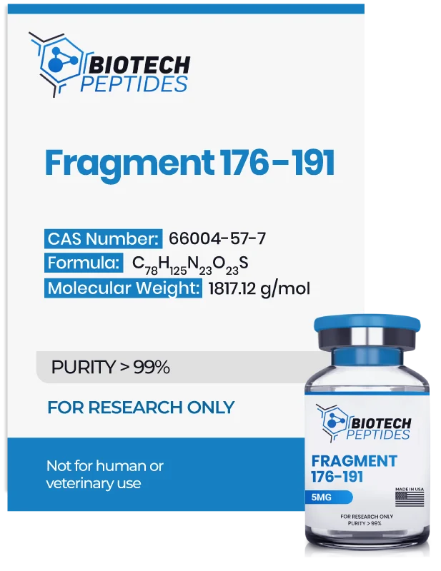 Fragment 176-191 peptide (Frag 176-191) is a short segment of growth hormone (hGH) and is sometimes referred to as the “lipolytic fragment.” The name was coined from initial research on animal systems, which suggested that Fragment 176-191 may potentially increase fat cell metabolism in genetically engineered obese mice. Growth hormone (hGH) supplementation is considered by scientists to generally suppress carbohydrate metabolism, alter sensitivity towards insulin, promote long bone growth, and heighten insulin-like growth factor-1 (IGF-1) levels. Extensive animal studies have suggested that this synthetic fragment may mimic the lipolytic action of hGH without other actions.[1]
