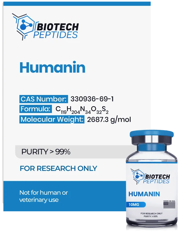 This peptide is thought to contribute to nerve cell damage observed in these models interacting with two specific G protein-coupled peptide receptors: Formyl Peptide Receptor-Like 1 (FPRL-1) and Formyl Peptide Receptor-Like 2 (FPRL-2). These receptors are believed to be expressed on the surface of neuronal cells and may play roles in neurological signaling pathways. By binding to FPRL-1 and FPRL-2, Humanin might support amyloid beta from interacting with these receptors, which may mitigate certain forms of neurological degradation associated with Alzheimer’s disease models.[2]