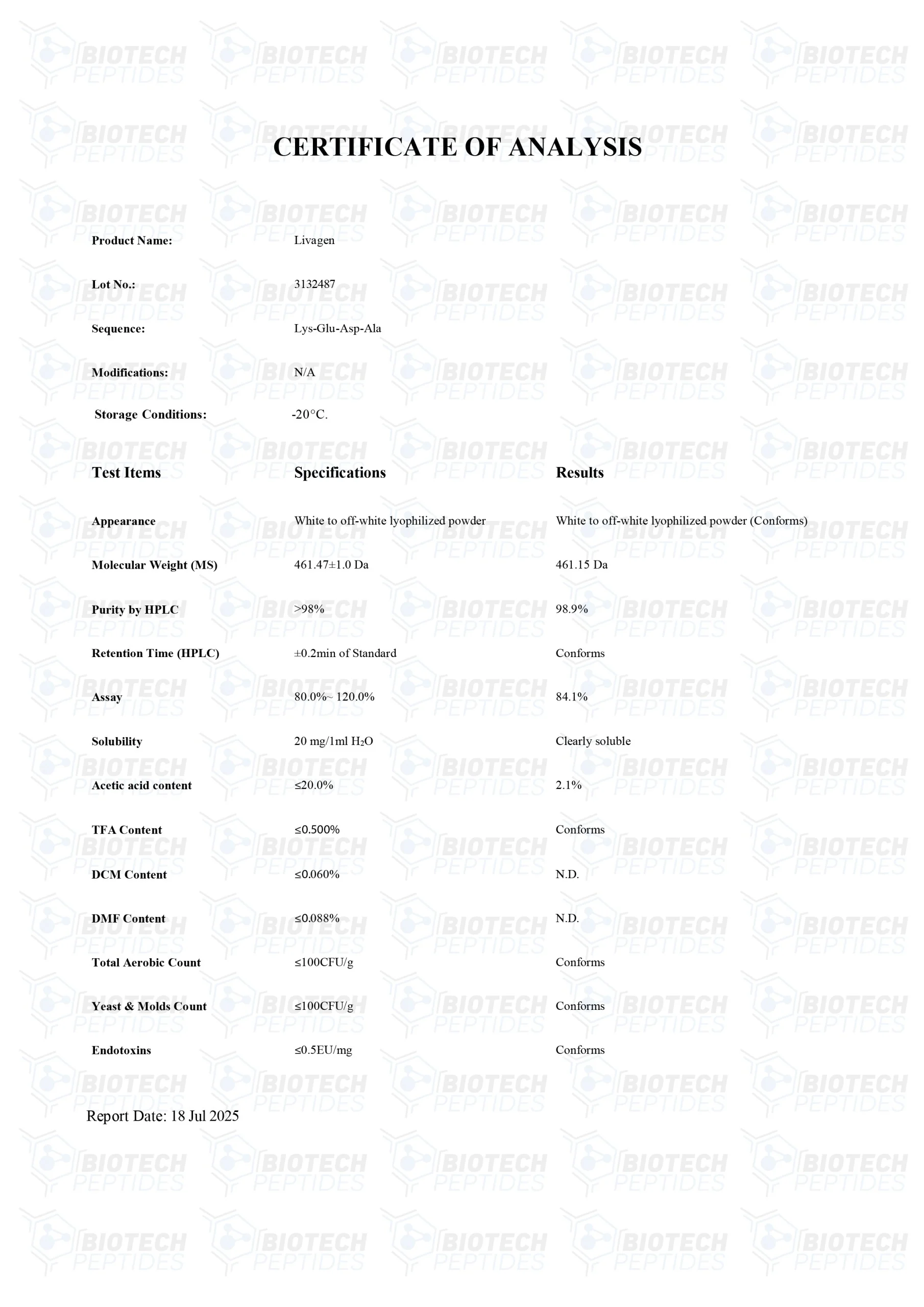 Livagen is a short peptide bioregulator, similar in structure to Epitalon. It is a tetrapeptide made of the amino acids Lys-Glu-Asp-Ala (KEDA) and is classified amongst Khavinson’s peptides. As a bioregulator, the peptide may interact with genetic material in different cells and consequently unpack and “unlock” various cellular genes. Livagen’s impacts appear to be exhibited directly on the lymphocytes (cells of the immune system), liver, and gastrointestinal tract (GIT). Its direct functions may be widespread, as suggested through research studies on DNA and gene expression patterns. The potential of the Livagen peptide to activate genes enclosed in the GIT and immune system may reflect possible age-mitigating characteristics exerted on cells.