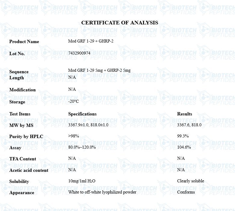 Modified GRF 1-29 (also abbreviated as Mod GRF 1-29), is a synthetic peptide analog of Growth Hormone Releasing Hormone (GHRH). It is a modified version of the first twenty-nine amino acids of the naturally occurring GHRH. This modification has been suggested to provide better stability and potentially reduce metabolic clearance. More specifically, the modifications may involve the substitution of four specific amino acids within the initial 29 amino acids of Growth Hormone-Releasing Hormone (GHRH). These changes occur at the 2nd, 8th, 15th, and 27th positions and may potentially enhance the peptide’s durability against enzymatic degradation, especially by enzymes such as dipeptidyl peptidase-4 (DPP-4). It is hypothesized that replacing L-alanine with D-alanine at the second position may increase resistance to molecular breakdown. Furthermore, replacing asparagine with glutamine at the eighth position might reduce the likelihood of asparagine reconfiguration and amide hydrolysis. Additionally, substituting glycine with alanine at the 15th position may improve bioactivity. Lastly, the switch from methionine to leucine at the 27th position is thought to help prevent methionine oxidation. It may lead to natural growth hormone production and increased levels of IGF-1 (Insulin-Like Growth Factor-1).[1]