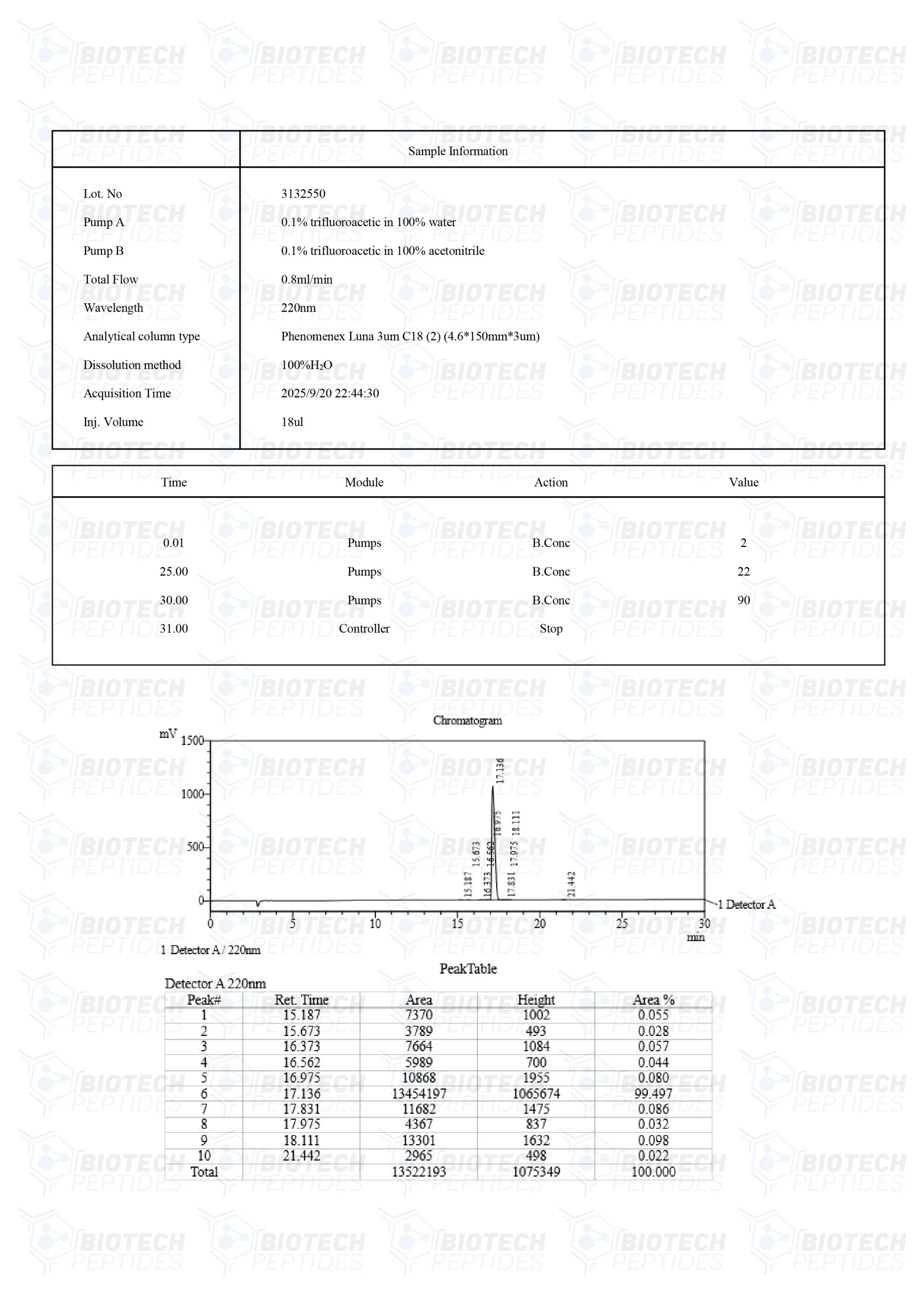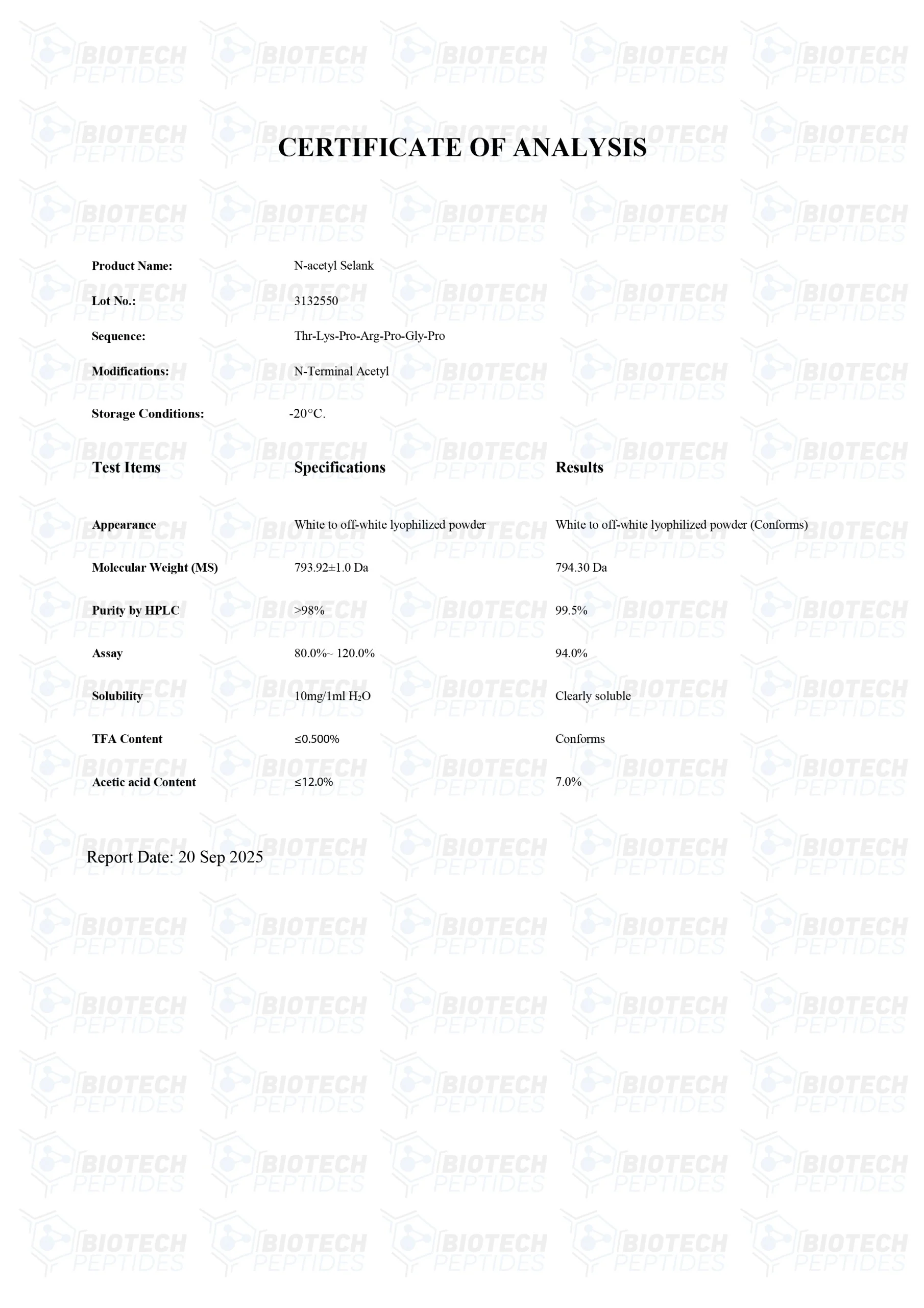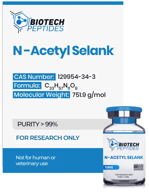 N-Acetyl Selank is an acetylated form of the Selank peptide. The acetylation of the peptide into N-Acetyl Selank appears to improve its stability. Selank is a synthetic analogue of the natural tetrapeptide Tuftsin. Tuftsin is an immunomodulatory peptide, and N-Acetyl Selank appears to share many of its potential functions. In addition, N-acetyl Selank also appears to exhibit an impact on neurotransmitters, brain signaling, and neuroplasticity.