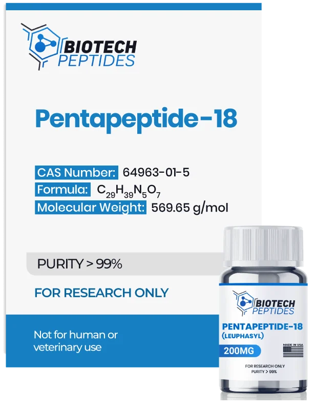 Pentapeptide-18 (Leuphasyl) is a modified analog of the naturally occurring pentapeptide leu-enkephalin, which is part of a class of peptides called enkephalins which are believed to directly interact with opioid receptors.[1] Structurally, Pentapeptide-18 differs from leu-enkephalin by the addition of D-Alanine in place of glycine at its second position. Pentapeptide-18 is thought to penetrate the epidermal barrier and influence cellular processes that affect muscle cell contraction. Studies suggest that it acts by modulating calcium release in neuronal synapses. By interfering with the signals that trigger muscle contraction, Pentapeptide-18 may help to relax muscles, reducing the formation of fine lines and wrinkles across the skin barrier. Additionally, modified versions of Pentapeptide-18 may interact with melanin production pathways, which is a pigment responsible for adding color to tissues and may play a protective role against UV radiation. By potentially influencing melanin synthesis, modified versions of Pentapeptide-18 may offer research value in skin tissue studies.
