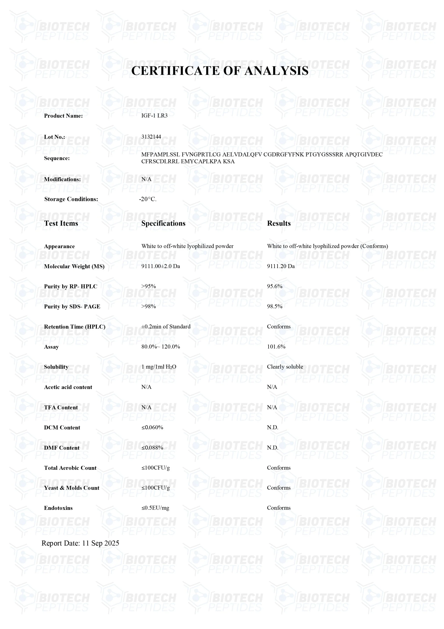 Receptor Grade IGF-1 LR3 is an altered variant of insulin-like growth factor-1; the complete name of the peptide is insulin-like growth factor-1 long arginine 3. IGF-1 derivatives have played important roles in research studies on cell proliferation, cell division, and cell-to-cell communication. Despite research reporting physiological potential similar to the parent protein, Receptor Grade IGF-1 LR3 does not appear to interact with IGF binding proteins (IGFBPs) as strongly as IGF-1. IGFBPs are a group of proteins that modulate the accessibility of Insulin-like Growth Factors (IGFs) within the bloodstream. This modulation potentially alters how IGFs engage with diverse bodily tissues. A reduction in the binding affinity of Insulin-like Growth Factor 1 Long Arg3 (IGF-1 LR3) for IGFBPs might potentially influence its bioavailability. Furthermore, this reduced binding might also affect the manner in which IGF-1 LR3 interacts with targeted tissues within experimental frameworks. Such alterations may lead to an enhanced potential of IGF-1 LR3, albeit possibly with a diminished duration of its active presence. This scenario suggests that the dynamics between IGF-1 LR3 and IGFBPs might be critical in determining the functional outcomes of IGF-1 LR3 in specific experimental contexts. The structural modifications in IGF-1 LR3 may have also contributed to the increased affinity of the peptide towards the IGF-1 receptors. The peptide is created by the inclusion of 13 amino acids to the N-terminus of native IGF-1 and by replacing the glutamic acid at position 3 with arginine, which ultimately leads to the formation of an 83 amino acid peptide.[1] The designation of Receptor Grade addresses the purity of the reference product, which is considered higher than Media Grade IGF-1 LR3.