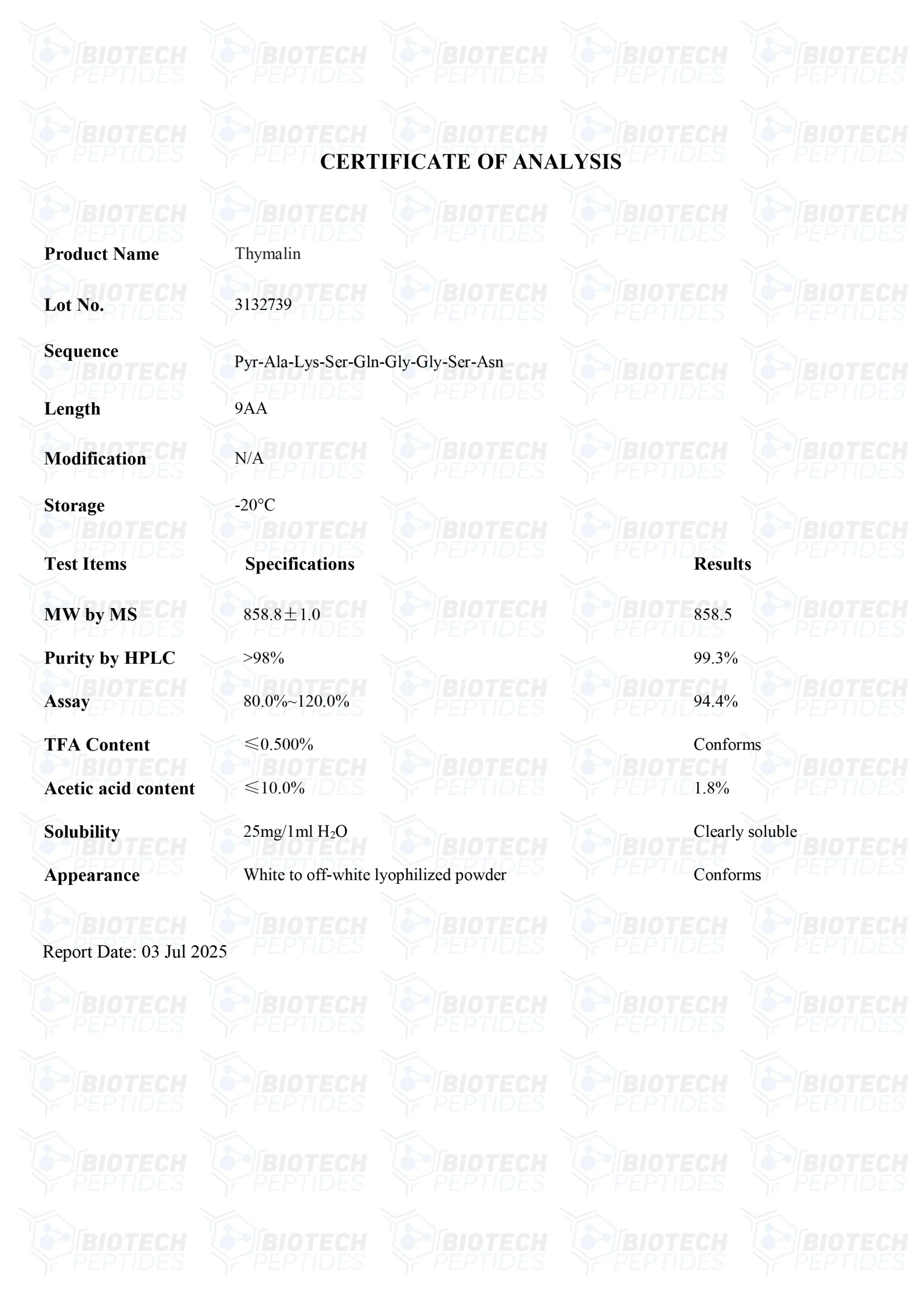 Thymalin, sometimes referred to as Thymalin Alpha-1, is the synthetic variant of the endogenous Thymulin, which was first isolated from the thymus in 1977. The endogenously produced Thymalin has been researched for its potential in a wide landscape of research areas, with its influence speculated to extend to regulatory action on inflammation, mitigation of pain perception, neuroprotective action, and immune function support. Early studies have suggested that Thymalin and other thymus and pineal gland secretions may also support cell longevity.