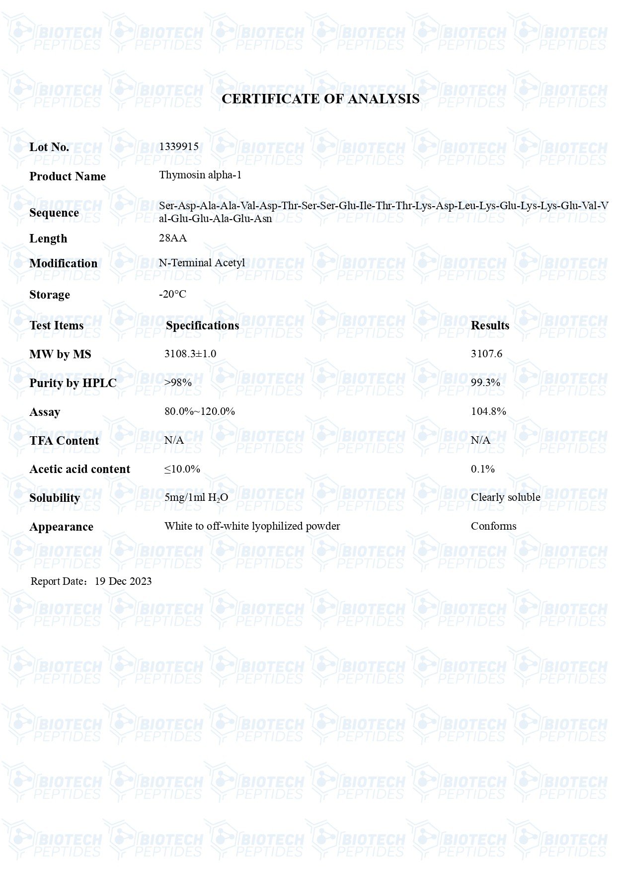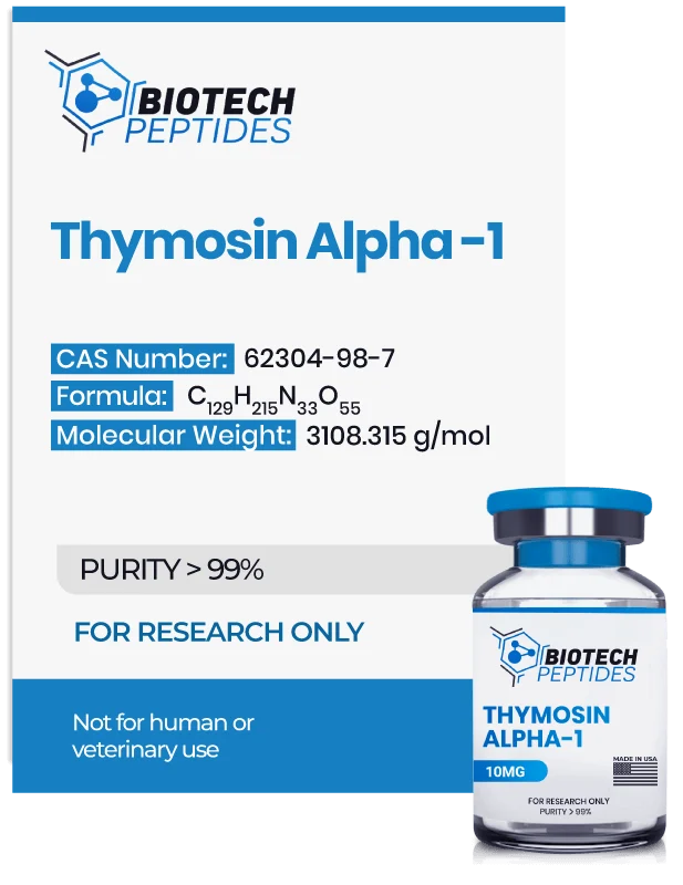 Thymosin Alpha-1, also known as TA1 or Tα1, is a naturally occurring peptide fragment that was discovered in 1972 and researched for its potential action within the context of studies relating to cystic fibrosis, infection (e.g., tuberculosis, cytomegalovirus), respiratory disorders, chronic hepatitis, and cancer. It is also referred to as Thymalfasin when synthetically developed. Originally, research on Thymosin Alpha-1 centered around its potential role in immune modulation. It is hypothesized that it might increase levels of Major Histocompatibility Complex (MHC) class I molecules and boost cytokine production, key components of the immune system that may enhance immune responses.[1][2] There is also a possibility that it might improve the activity of natural killer cells, which target virus-infected cells and tumors. Furthermore, it might enhance the expression of specific markers on T cells that are considered critical for their identification and function in the immune system, indicating a significant role in immune regulation. Thymosin Alpha-1 is also thought to possibly increase the presence of high-affinity interleukin-2 receptors on cell surfaces, potentially leading to the vigorous activation and proliferation of T lymphocytes, elements of immune response. There is speculation that it may affect both T-helper and cytotoxic T-cell populations, deemed essential for eliminating infected cells. Additionally, it might prompt the differentiation of thymocytes—precursor cells in the thymus—and peripheral blood lymphocytes into mature immune cells, increase natural killer cell numbers, and promote cytokine-driven inflammatory responses. Research also explores its potential role in enhancing macrophage efficiency—cells that engulf and digest pathogens—and in regulating the activity of alpha thrombin, a protein involved in blood clotting, highlighting its broad potential on immune function.[1][2]